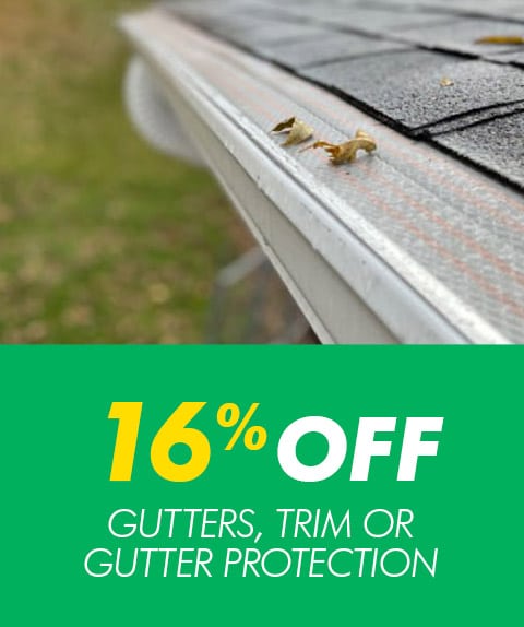 Redeem now Purchase at least 100 feet of gutters or gutter protection and receive 16% off the price the materials and installation. Can’t be combined with any other offer. Offer expires April 30, 2026. See disclaimers page for complete details.